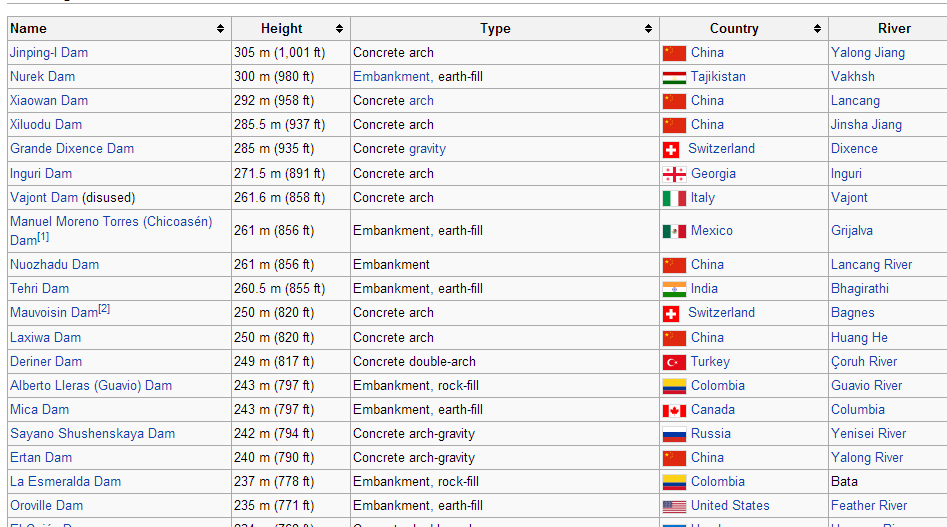 Many people thinking of big dams think of a dam’s height. This list only goes down far enough to pick up the first U.S. dam, which is in California. (It was in the news in 2016 for almost failing.) There are six higher dams in China; no other country has more than two. The implication is that the Chinese are ambitious engineers.