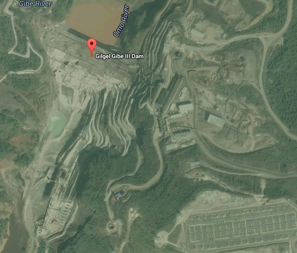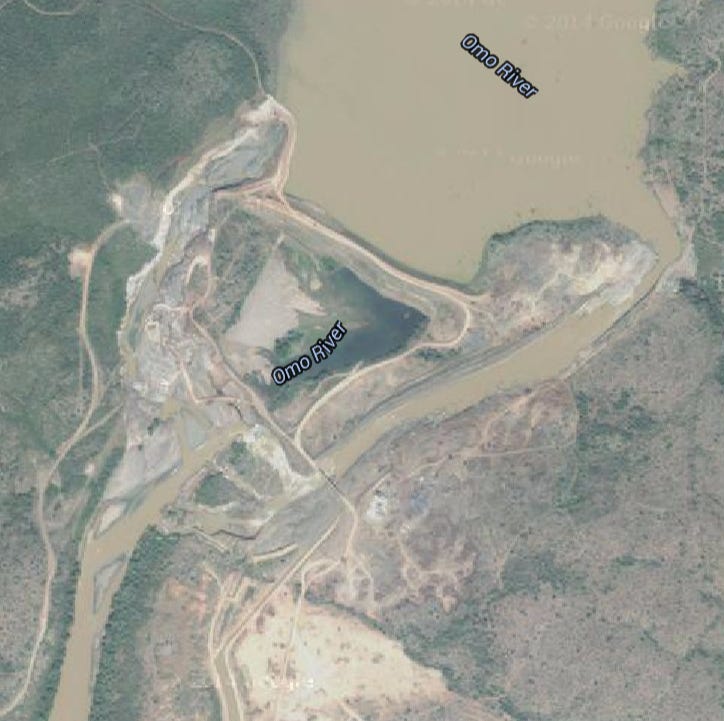 Here’s another Ethiopian dam, Guri III, on the Omo River. This is one of several dams in a cascade on the Omo River, which flows south into Lake Turkana. The Ethiopian government is keen not only to generate power but in this case to divert stored water into canals irrigating sugarcane.