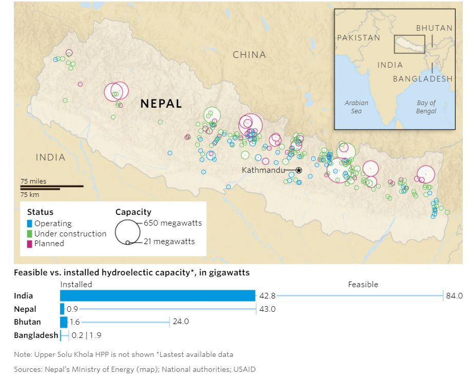 The purple circles are planned hydro projects in Nepal, which hopes to make money selling electricity to India. As the bar chart suggests, Nepal has barely begun to develop its hydro potential. The risks (earthquakes, for starters) are huge, but so are the potential profits. And it’s not like Nepal has a lot of choice. A Nepalese engineer says, “The only resource we have, like the Arabian countries have oil, is water.”