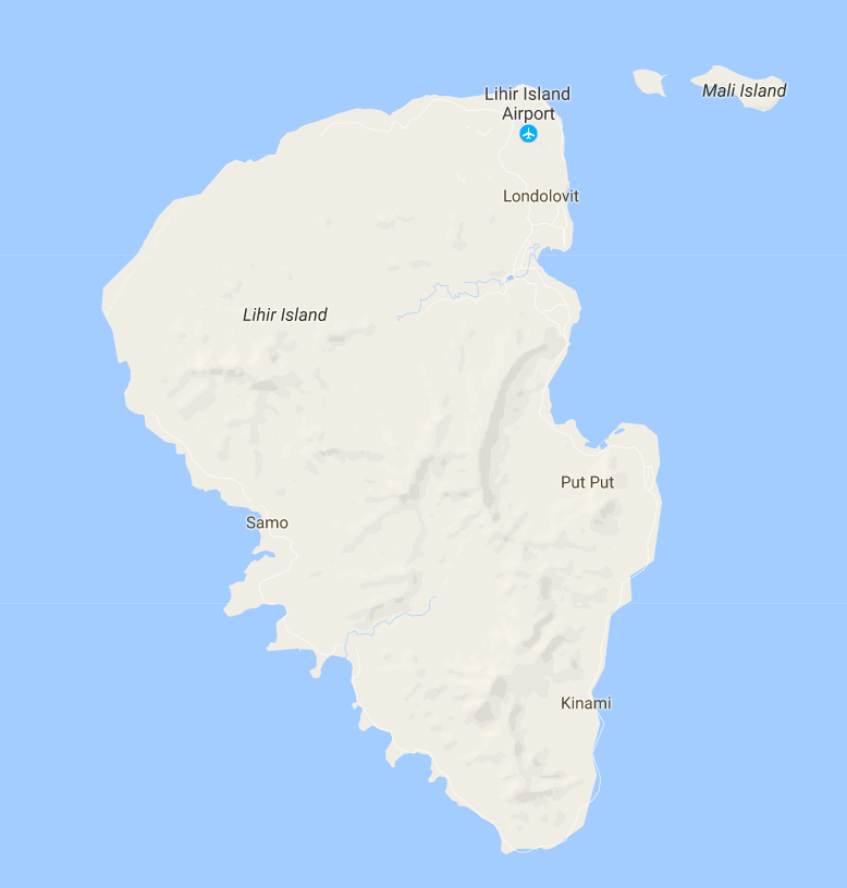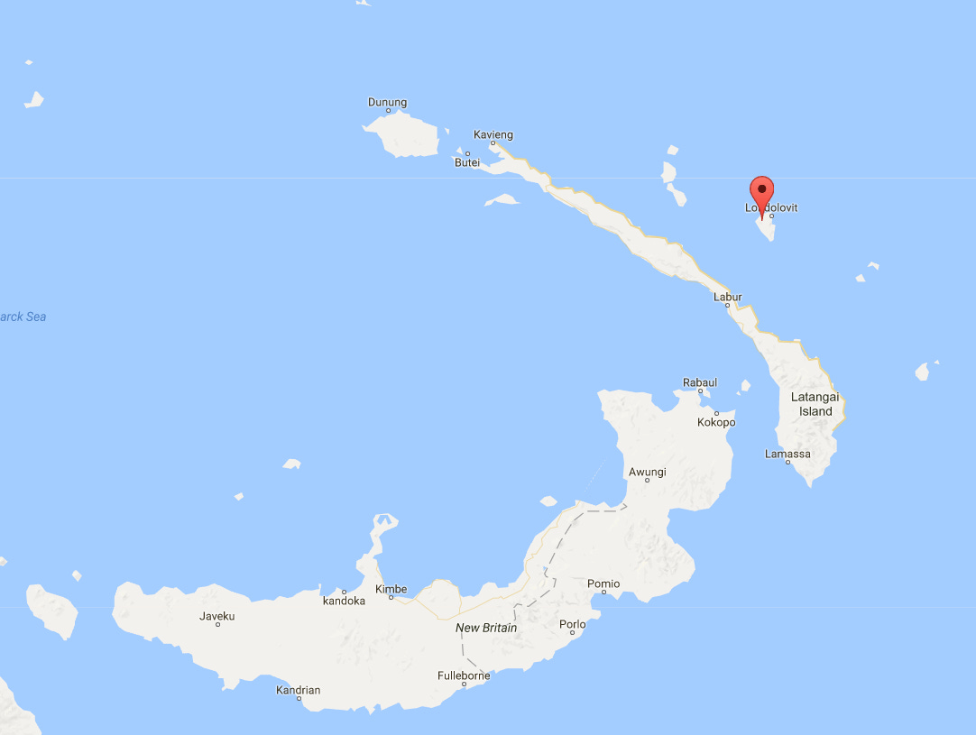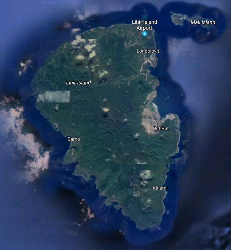 Here it is again, this time with a neighbor that used to be called New Ireland but is now Latangai Island. The pin is on a tiny volcanic island called Lihir.