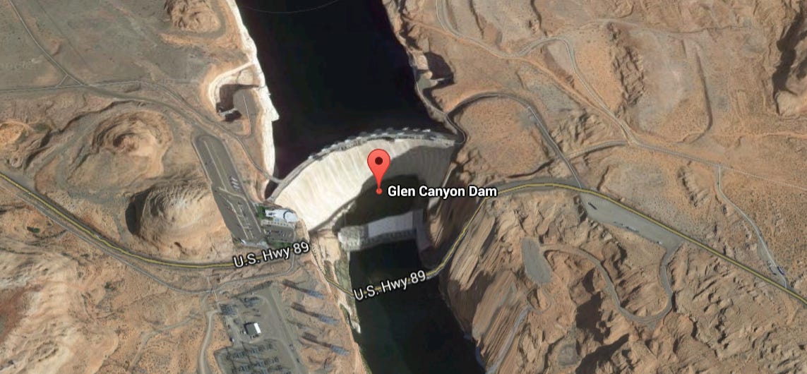 It’s Glen Canyon, the last big dam built in the U.S. It forms Lake Powell on the Colorado River upstream from the Grand Canyon. Environmentalists fought to stop the dam, lost the battle, but won the war. Meaning: we don’t build big dams any more.