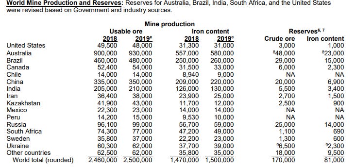 The 18 million tons of copper produced annually worldwide seems like a lot, but it's trivial compared to 6he billion-plus tons of iron produced annually. Here are the countries that have the most iron ore. Notice the U.S. down at the bottom.