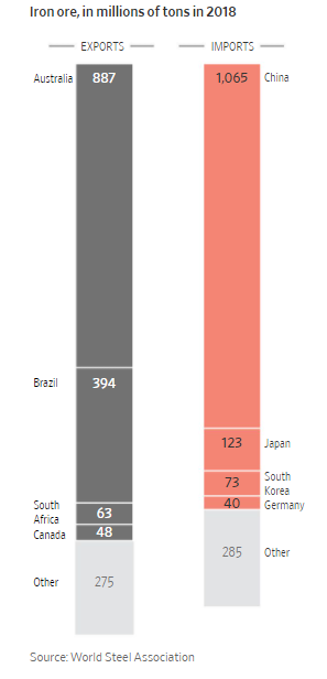 A summary view: Australia exports about half of all the iron-ore exported worldwide; China buys about two-thirds of it.