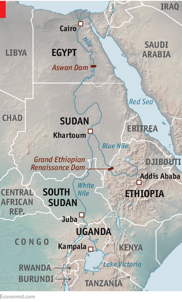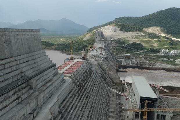Even though the dam isn’t designed to divert water from the river (as, for example, Grand Coulee does, for irrigation), filling the reservoir will inevitably reduce the amount of water flowing downstream while the dam fills. Ethiopia would like to get the turbines spinning, but Sudan and Egypt would prefer the reservoir fill slowly.