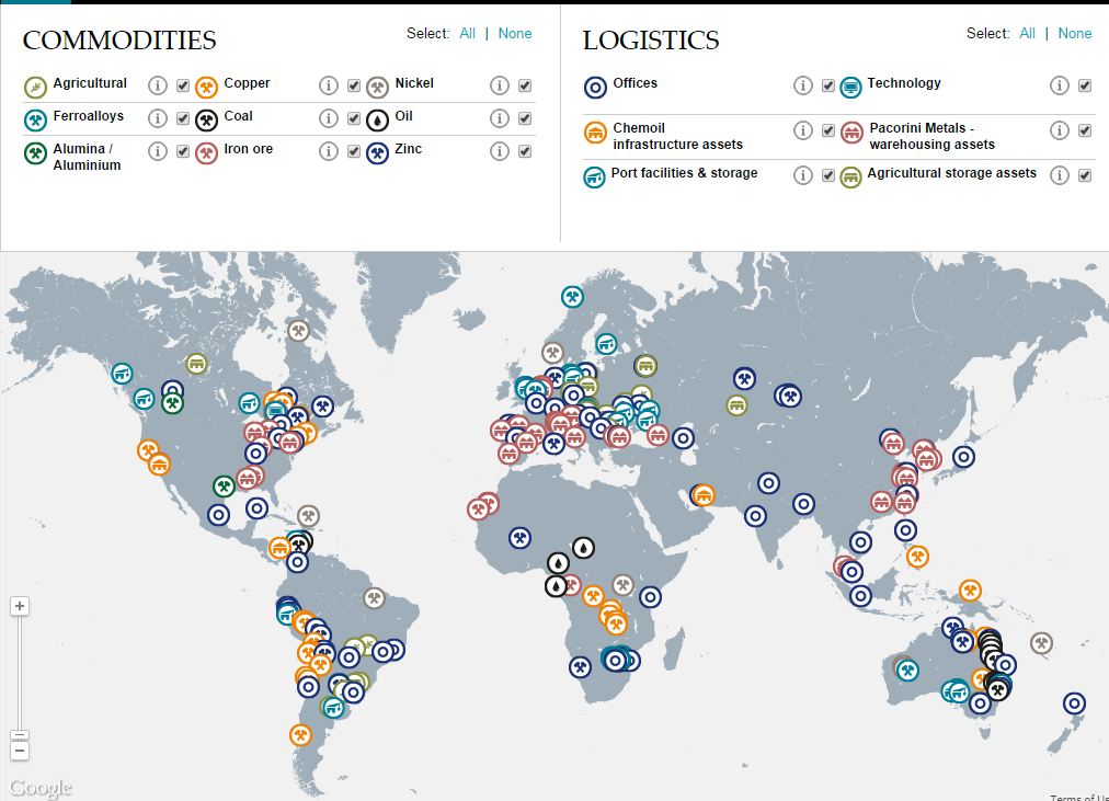 Here's a map of Glencore's operations. How’s that for a global footprint? See the orange for copper? It pops up in the places we saw earlier, especially the American Southwest, Chile, and the Copperbelt.