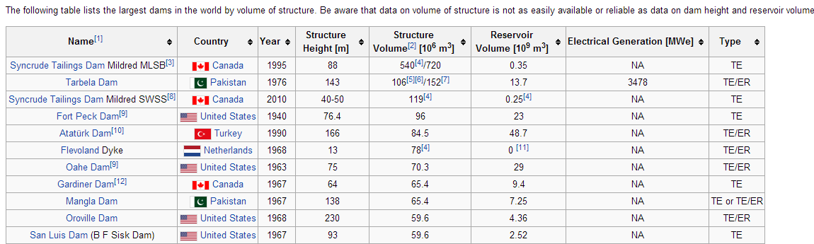 Another measure is the volume of material in the dam. This is interesting because #1 and #3 were built in connection with the development of the Athabaska tar sands of Alberta. Tarbela is on the great river of Pakistan, the Indus. Interestingly, the U.S. shows up here four times, the first two both on the Missouri River.
