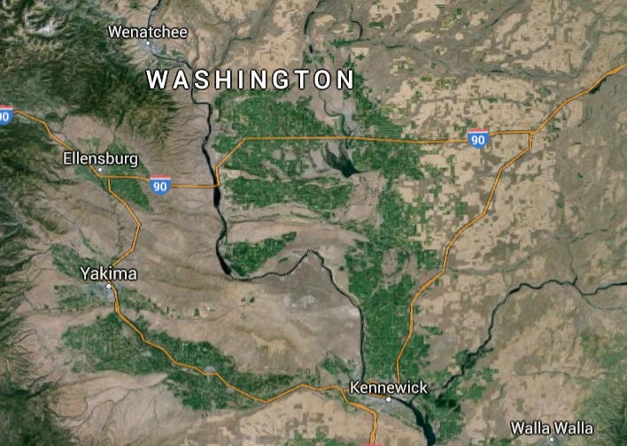 The system irrigates about half a million acres traversed by I-90 and extending south to Kennewick. It’s the Columbia Basin Project, built mostly in the 1950s. What’s grown? Think potatoes first, for French fries. Is this a sensible use of electrical power? I bet the potato growers of Maine, squeezed out of business by farmers here, don’t think so. “Hey,” they may say, “our crops wither in dry years for lack of rain. You guys get good crops with irrigation that you couldn’t possibly afford if the government didn’t sell it to you below cost. That’s not fair.”