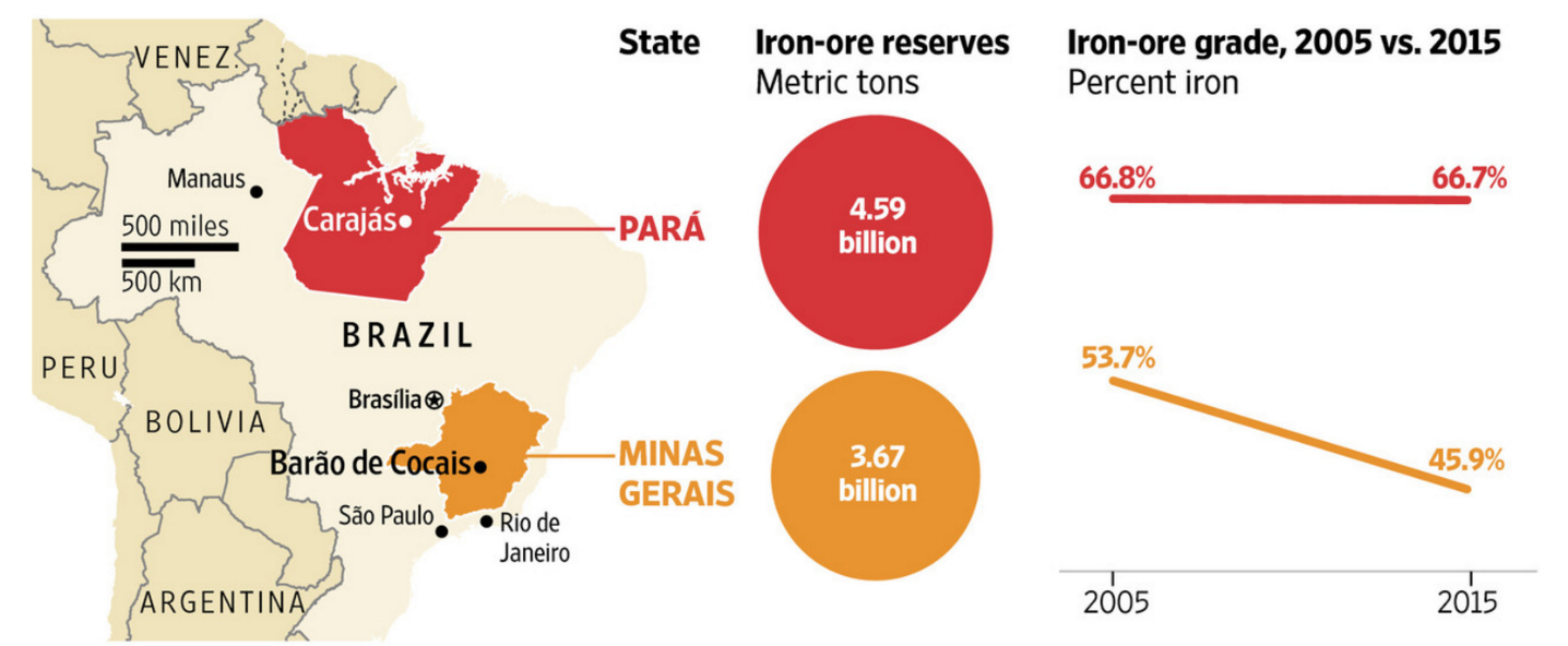 There’s lots more iron ore nearby. Less than 30 miles to the south, a $14 billion mine opened in 2016. Vale predicts it will be in operation for a century. Its name is very unromantic—S11D—but there was plenty of excitement during its development, because the world price of iron ore was $191 a ton in 2011, when development began. Five years later, as the mine was close to opening, the price was $37 a ton. Sounds disastrous, but the company’s cost of digging the ore and getting it by rail to the coast is less than $8 a ton.