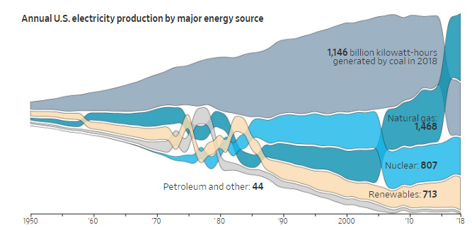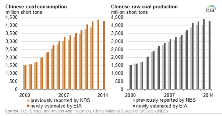 For anyone worried about climate change, this is a very encouraging graph. You see why? Yes, it shows the meteoric rise of Chinese coal production and consumption, but it also shows a decline in the last few years. The graph stops several years ago, but the downward trend has continued, so that production in 2020 is targeted at 3.9 billion tons. Is China using less energy? Of course not: it’s shifting to renewables fast, partly to reduce global warming but also (and probably more) because people in Beijing (and elsewhere) would like to be able to step outside and breathe.