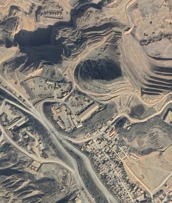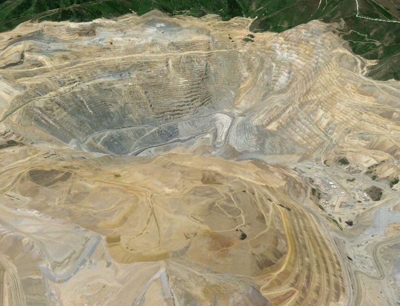 The previous maps don't tell you anything about the size of these mines, but many of them are huge. Here's the Bingham Canyon Mine, alias the Kennecott Copper Mine, near Salt Lake City. The mine has produced copper and other minerals for about a century. It's still going strong.