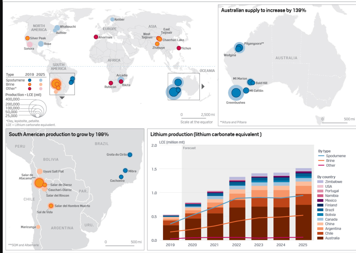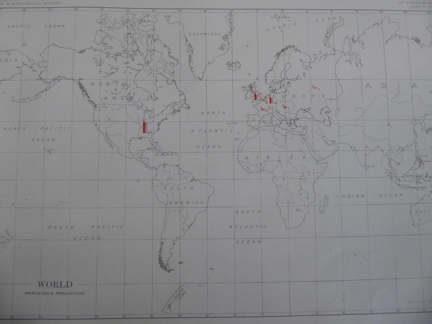 There are three big companies supplying that ore. Here’s a map of one of them, BHP, which has major operations around the world with the prominent exceptions of Russia, China, and India. (The name BHP comes from Broken Hill Proprietary, a fabulously rich mine in the town of Broken Hill, Australia. The company quit mining there in 1939, but small fry keep digging, nowadays for zinc and lead instead of for the silver that made some people rich.)