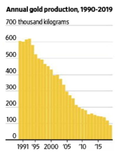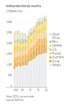 Is Australia a big producer of gold? The metal comes from lots of countries, and no one country dominates production. Maybe Australia ranks second; it certainly is in the top handful. See South Africa? See it declining?