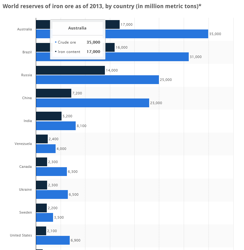 http://www.statista.com/statistics/267381/world-reserves-of-iron-ore-by-country/