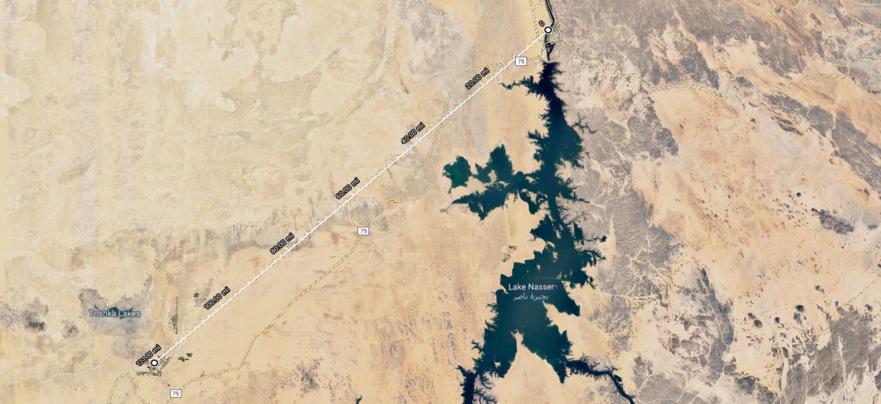 Even without the dam, Egypt and Sudan face water shortages. Here’s a ruler stretched from Egypt’s High Aswan Dam west to the Toshka Lakes.