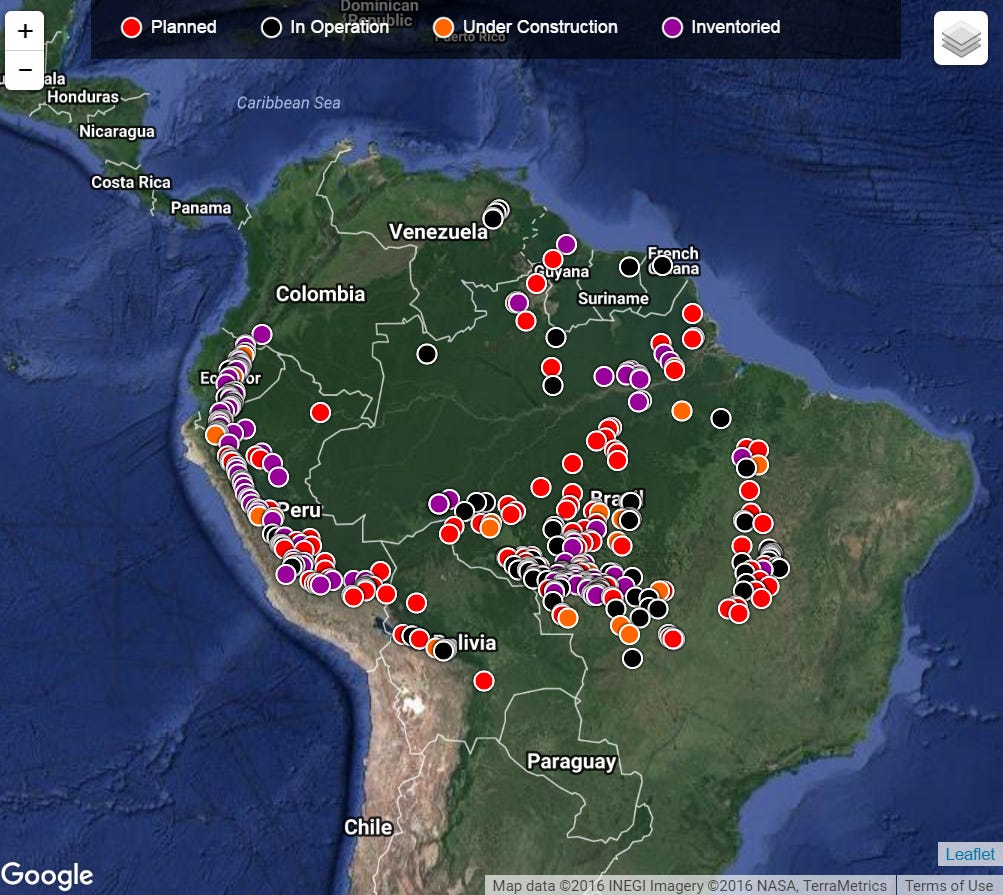 There are only a few hydropower projects operating in the Amazon Basin (black circles), but there are several under construction (orange) and a zillion planned (red) or inventoried (purple).