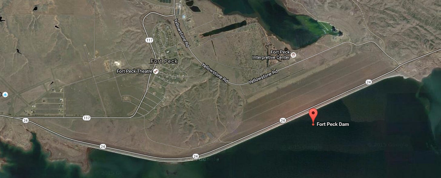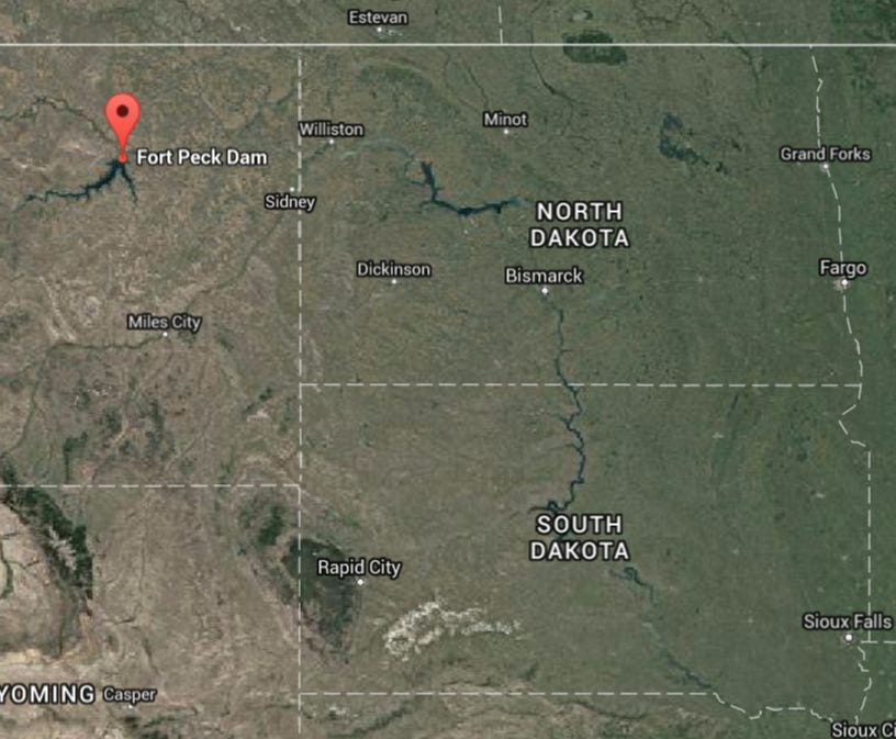 The other Missouri River dam on the list is the Oahe, hidden here under the label “South Dakota.” Just upstream from the label “North Dakota” is a third big dam on the Missouri. It’s the Garrison Dam, built in the 1950s.