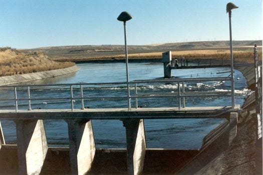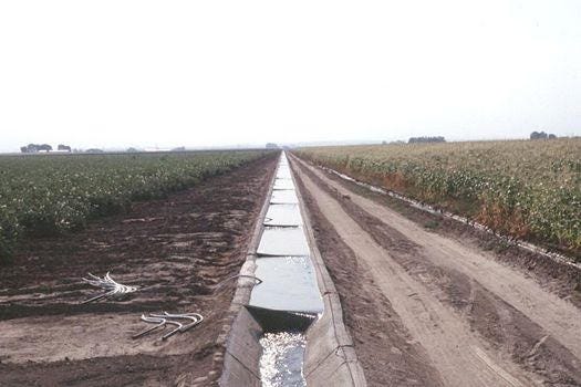 The canal branches into the equivalent of capillaries, here with plastic check dams and siphon pipes to get water into the furrows across a corn field.
