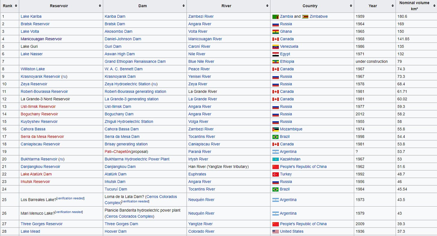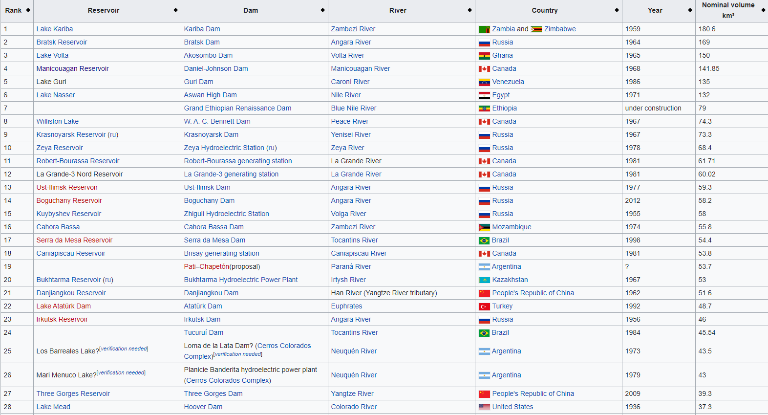 The biggest reservoir in the U.S. is No. 29, Lake Mead, behind Hoover Dam. Its capacity is less than a quarter the size of #1 (the reservoir volumes are expressed in the far-right column in cubic kilometers). Three countries dominate the list: Russia, Canada, and China.
