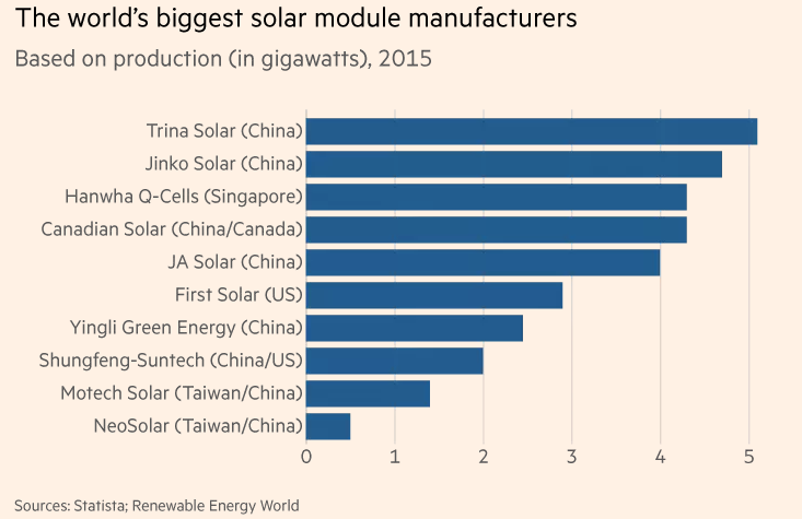 Then look who’s making the equipment for the solar power. China simply dominates the market. America is on the sidelines.