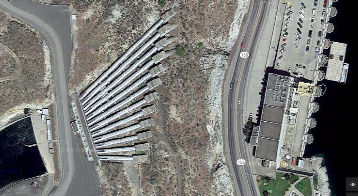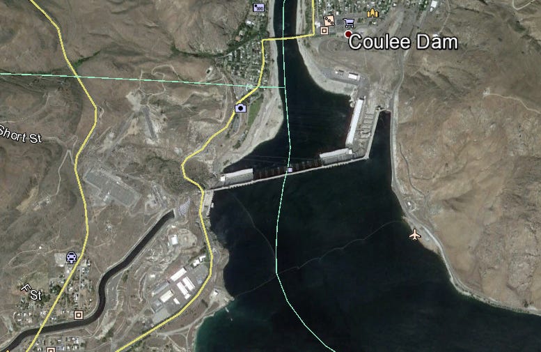 Here’s Grand Coulee, the biggest hydropower producer in the U.S. Much of the power goes to pumping water uphill several hundred feet so it can enter that canal you see at the lower left.