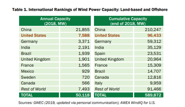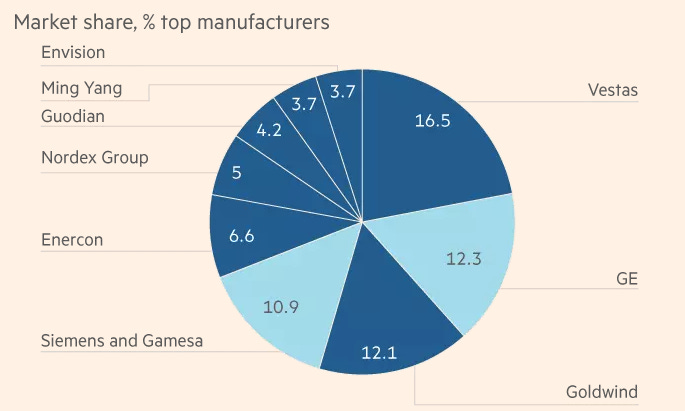 The U.S. is pretty much out of the wind-power business, too. GE is a significant player, but all the other big companies are foreign. Vestas is Danish, Goldwind is Chinese, Siemens, Enercon, and Nordex are German, and the other three shown here are all Chinese.