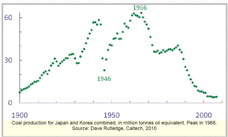 Production in the UK peaked around World War I, and even as late as 1954 the country had about 1,400 operating coal mines. Today it has about 20 open-pit mines but no underground operations. In 1920 the country had over a million coal miners; by 1960 it had 600,000; today it has perhaps a thousand.