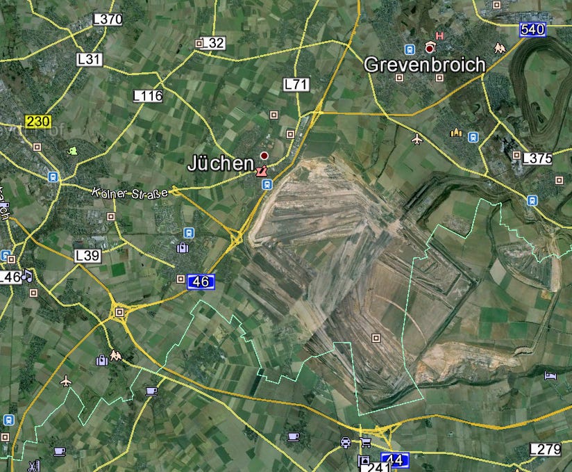 Here’s the difference: Germany is phasing out its underground mines, which are heavily subsidized, but it will continue for some years to produce soft coal (lignite) from surface mines. Here’s one of those mines, the Garzweiler mine, about 16 miles west of Düsseldorf. Grevenbroich bills itself as Germany’s energy capital, though the German government announced its intention of ending all coal mining by 2038.