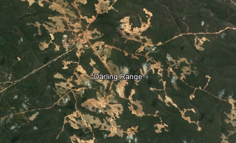 Such scenes make big, mechanized mines look good. Here’s Mt. Whaleback, an iron-ore mine owned by BHP near the town of Western Australia town of Newman. No garimpeiros here.