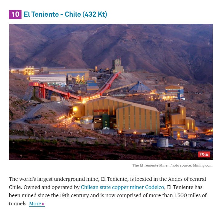 The three biggest Chilean mines are largely owned by companies we’ve already bumped into. Escondida (“The Hidden”), for example, is mostly owned by BHP and Rio Tinto. The chief exception is El Teniente (“The Lieutenant”), at the bottom here. It’s owned by Codelco, Chile’s national copper company, formed in 1971 by nationalizing all the private mines at that date. (Escondida was discovered later.)