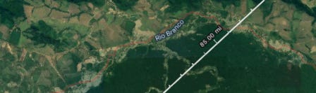 I’ve come up to the top of the reserve to show how the boundary (in red) coincides closely with the Rio Branco and with the shift from forest to farmed land. See that creek reaching deeper into the forest?