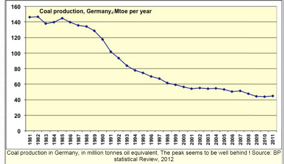 Coal production in Germany, too, is in long-term decline, though not quite as steep as in the UK.