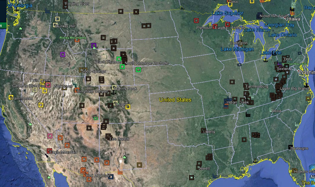 That's gold (yellow, of course) in northern Nevada, copper (burnt orange) in the Southwest, coal (black) in Wyoming and West Virginia, and iron ore (looks like the copper color) around Lake Superior.