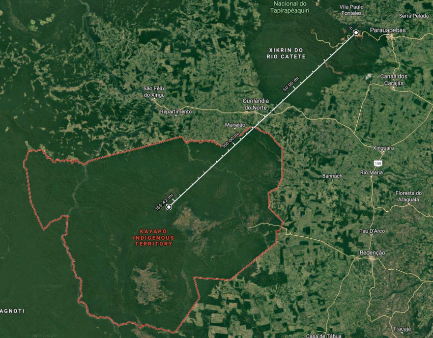 I’m going to take a short detour. The ruler below stretches about 150 miles from the Carajás mine down to the center of the Kayapo Indigenous Territory.