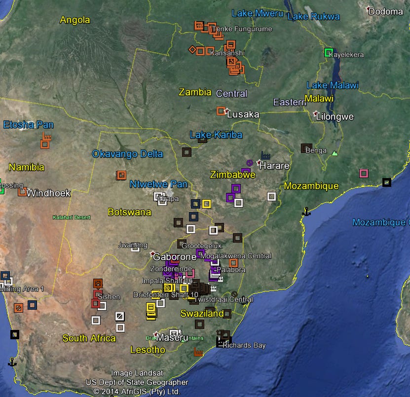 Here's copper in the (brilliant name!) Copperbelt, shared by the Democratic Republic of the Congo (DRC) and Zambia. (The mines are mostly in or near the DRC’s southeastern prong, or pedicle, which nearly cuts Zambia in half.) There's gold in South Africa. White is diamonds.
